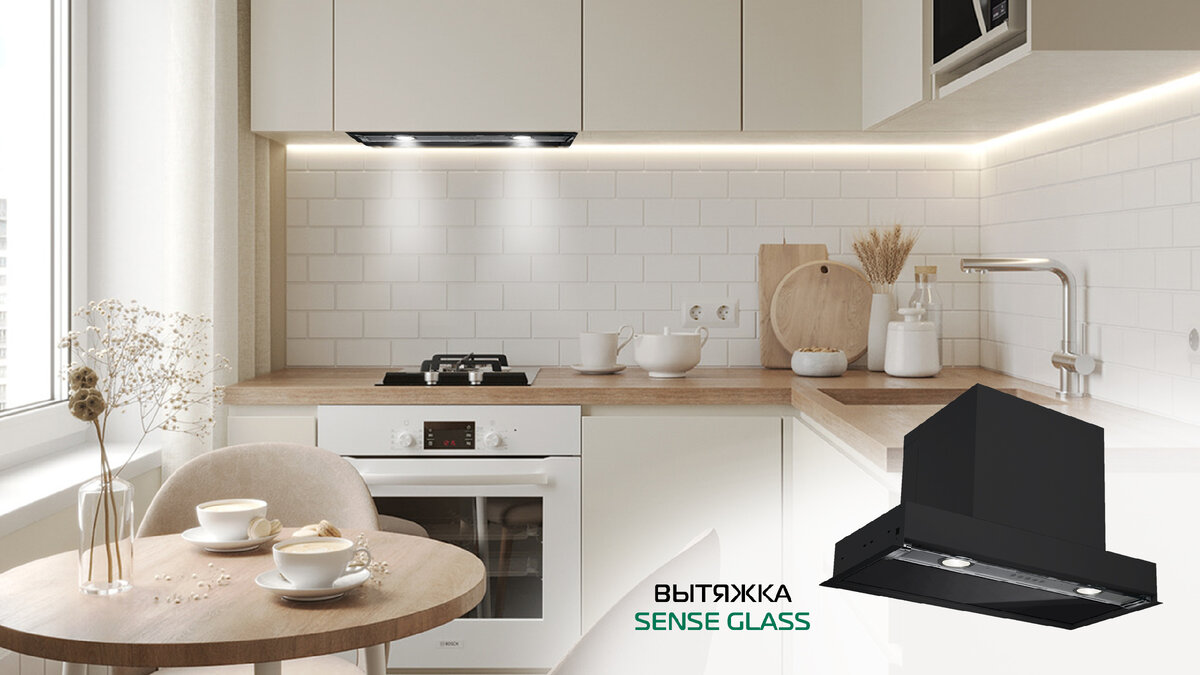 Пример стильного акцента – вытяжка Sense Glass с закалённым стеклом и высокой производительностью (до 1000 м³/ч), которая обеспечит свежий воздух на кухне до 40 м².