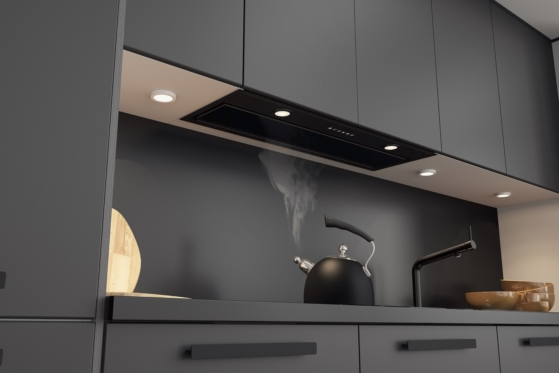 Благодаря плоской нижней панели корпуса, встроенная в шкаф вытяжка абсолютно незаметна после установки. Это позволяет интегрировать вытяжки Elikor в интерьер любого стиля и формата.