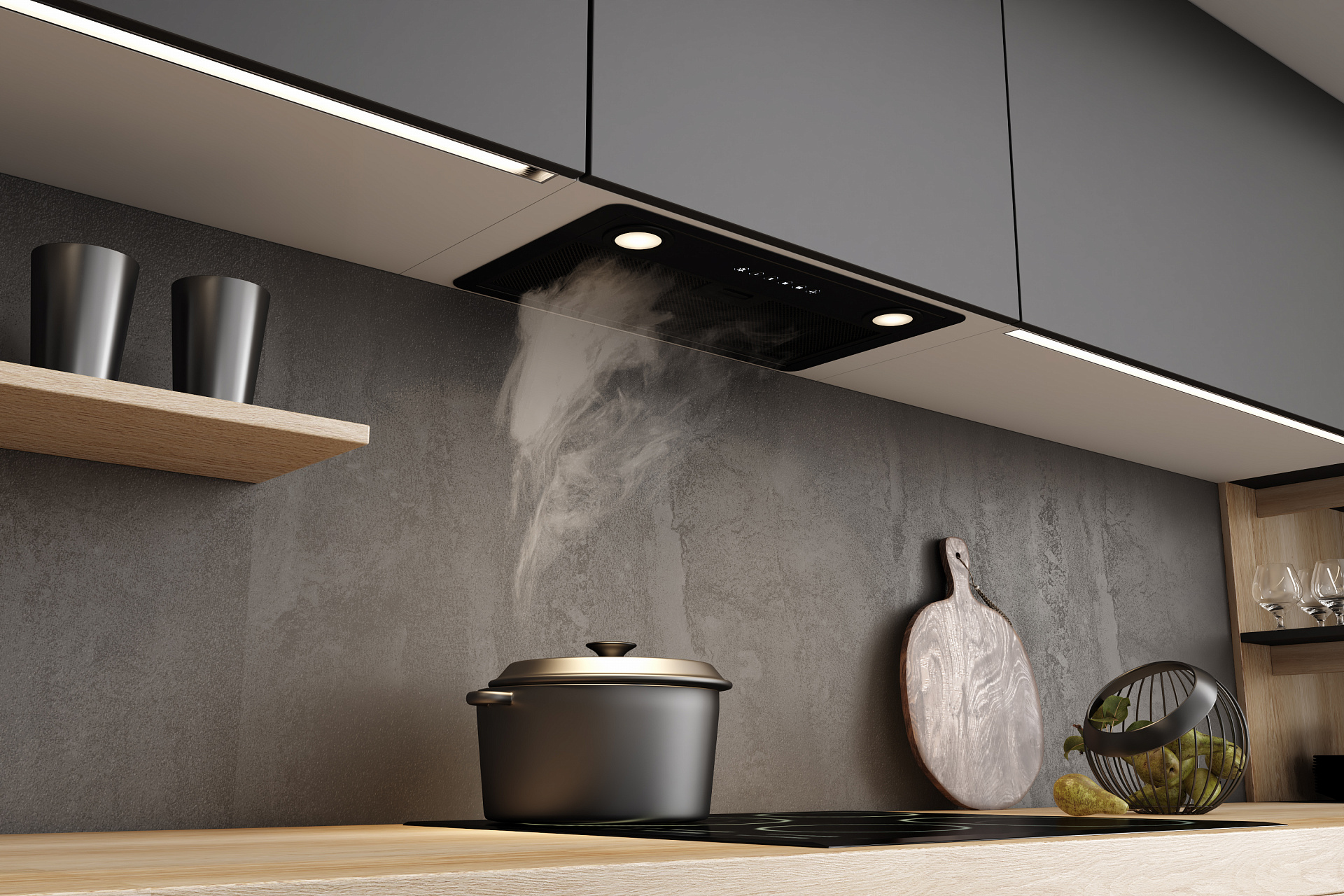 Благодаря плоской нижней панели корпуса, встроенная в шкаф вытяжка абсолютно незаметна после установки. Это позволяет интегрировать вытяжки Elikor в интерьер любого стиля и формата.